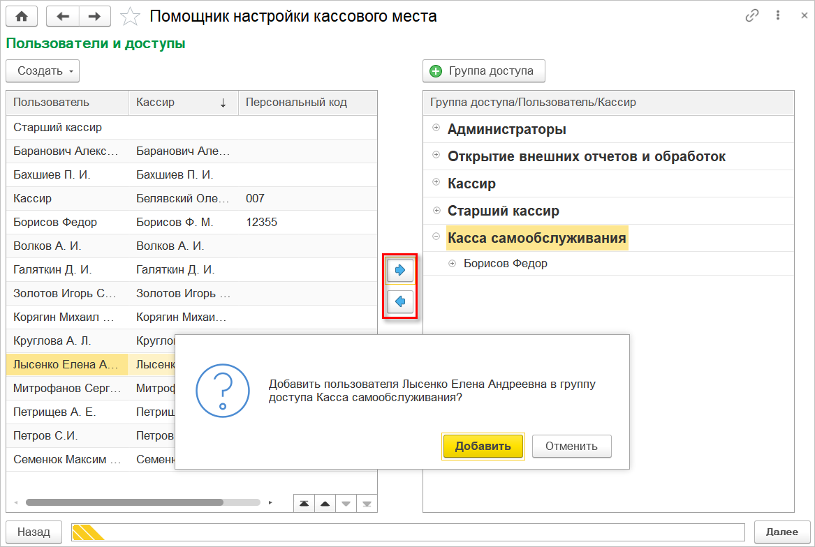Добавить участника в группу доступа можно и в общем списке . Для этого нужно выделить пользователя из левой таблицы, группу доступа в правой таблице, переместить пользователя в правую часть с помощью синей стрелки, и согласиться с предложением программы. Вторая стрела, расположенная ниже, предназначена для удаления участника из группы доступа.