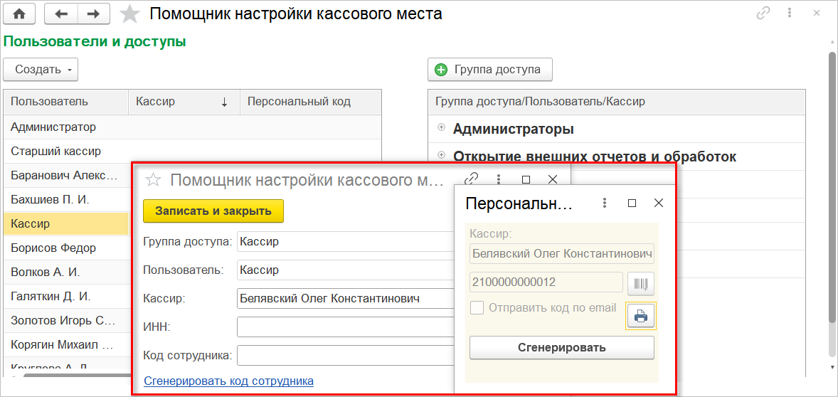 Если пользователь добавляется в группу доступа с предопределенным профилем «Кассир» или «Старший кассир», то откроется форма создания кассира. Здесь указывается группа доступа, кассир для входа, ИНН кассира и персональный код. Если код сотрудника не задан, то по гиперссылке «Сгенерировать код сотрудника» можно создать код, распечатать или отправить на почту.