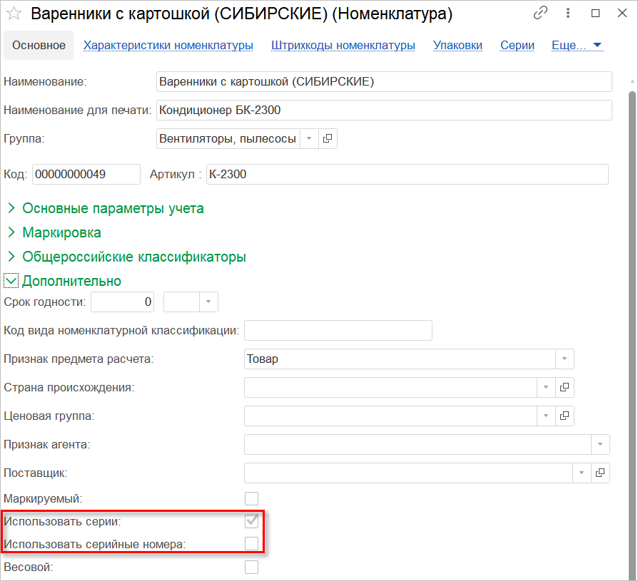 В виде номенклатуры имеются дополнительные настройки "Использовать серии" и "Использовать характеристики", которые могут отличаться от настроек позиции номенклатуры.
