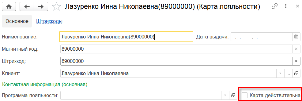 Недействительный статус карты. Появилась возможность обрабатывать, загруженный из программы 1С:ERP статус действия карты. При поиске карты в справочнике и через сервер лояльности будет проверяться ее статус, и если карта окажется недействительной, то будет выведено соответствующее сообщение.