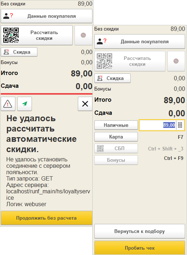 Теперь ошибки расчета будут выведены как при получении ошибки во время проверки соединения, так и непосредственно во время вызова расчета скидок. При продолжении без расчета скидок, если включен журнал действий кассира и это не администратор, происходит запись в журнал действий кассира о продолжении без расчета скидок. Дальше, если вернуться на этап ввода товаров, а затем обратно перейти к оплате, то скидки уже не будут рассчитываться для данного чека. Но расчет скидок может быть вызван нажатием кнопки «Рассчитать скидки», и если они успешно рассчитаются, то автоматический расчет скидок будет восстановлен для данного чека.
