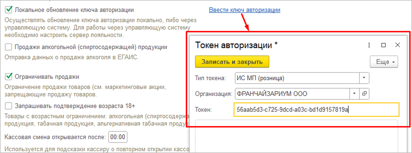 Локально ввести ключ авторизации можно по одноименной ссылке в разделе "Продажи" настроек РМК. Для подключения к ГИС МТ используется токен авторизации с типом "ИС МП (розница)" по конкретной организации.