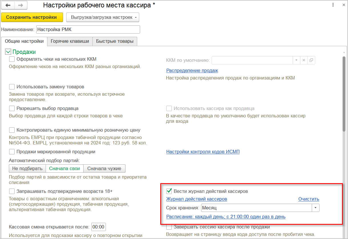 Добавлен инструмент для контроля действий кассира. Теперь в разделе "Продажи" настроек РМК можно включить ведение журнала действий кассиров, указать срок хранения данных и очистить их.