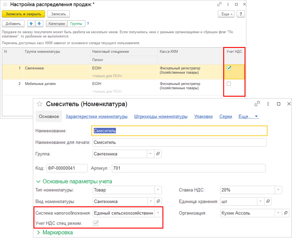 Чеки с таким распределением будут пробиваться с ЕСХН, учитывая НДС.