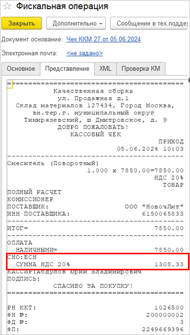 Одновременно просканировать или проверить маркированные товары не удастся, так как касса будет занята сессией проверки предыдущей марки. Подобная ошибка должна возникать при попытке войти в РМК с кассой ККМ настроенной на облачную ККТ. Пробитый в облаке чек выглядит, как обычный пробитый чек. У чека также есть запись в регистре фискальных операций.