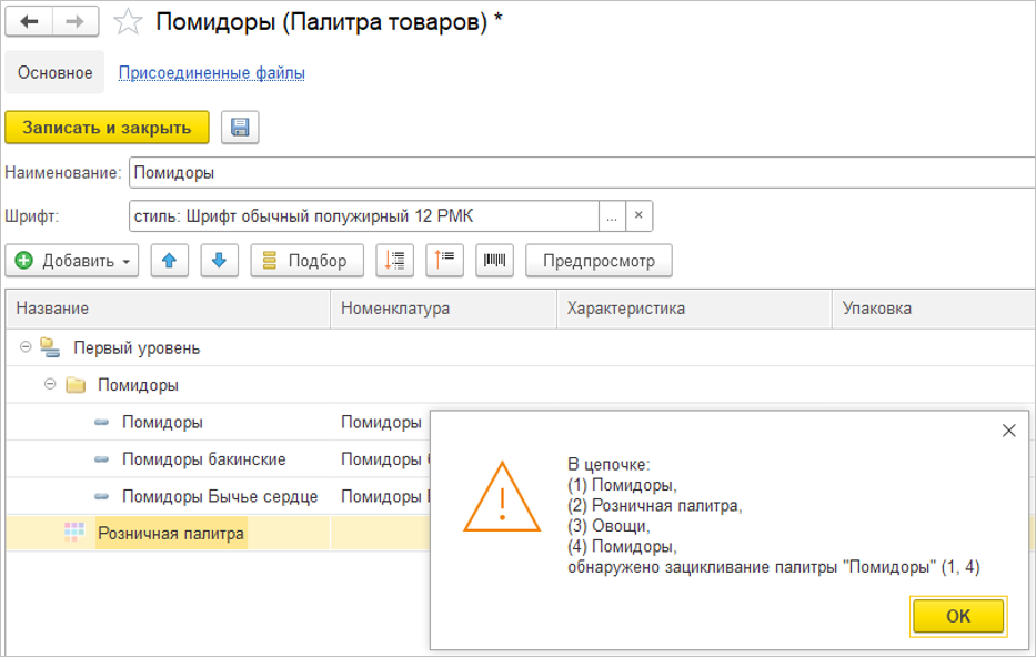 Перед сохранением палитры происходит проверка зацикленности вложенных палитр.