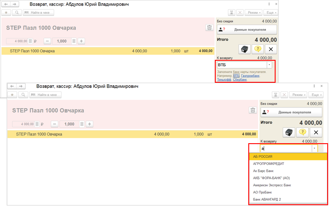 При возврате товаров упрощен выбор банка. Сначала предлагается список наиболее популярных банков, а при вводе названия работает автоподбор.