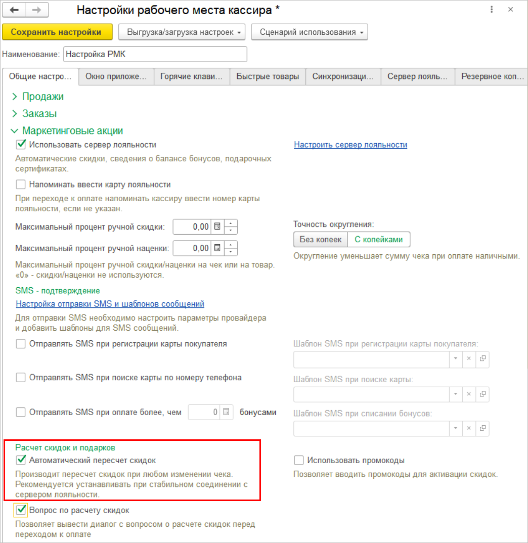 Появилась возможность автоматического расчета скидок без использования кнопки "Рассчитать скидки" и дополнительных команд. Для этого достаточно включить флажок "Автоматический пересчет скидок" в разделе "Маркетинговые акции" настроек РМК, если используете сервер лояльности.