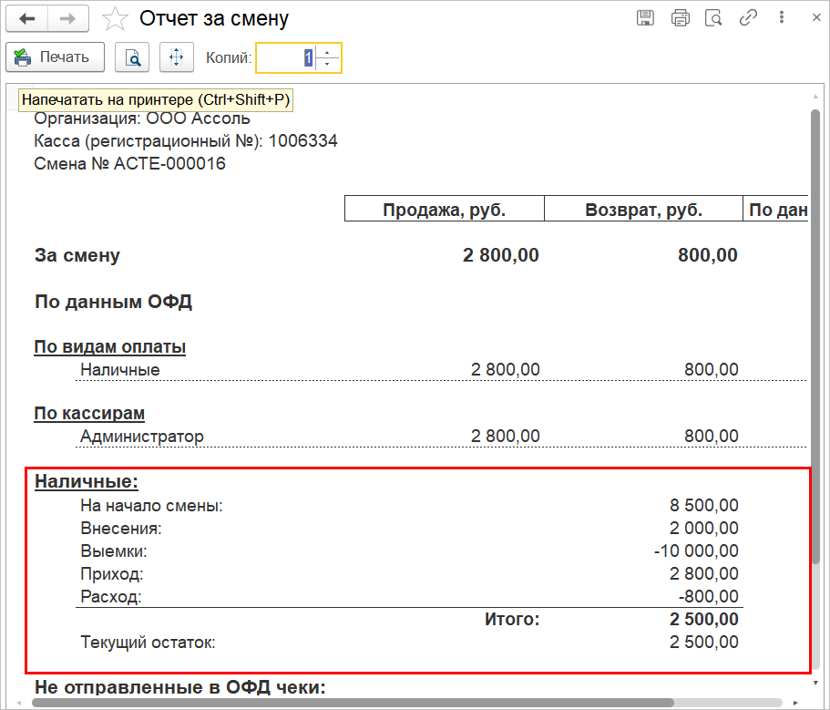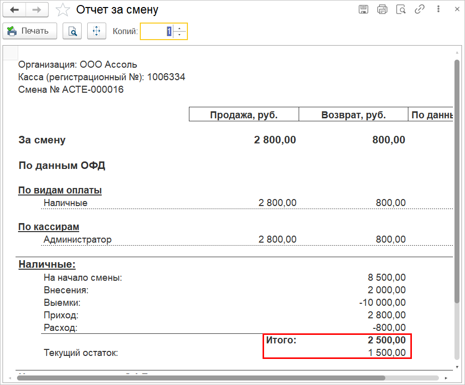 В "Отчете за смену" также будет отображаться текущий остаток и все формирующие его движения наличных денежных средств.