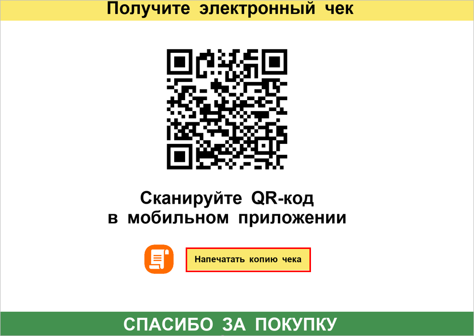 При формировании QR-кода кассового чека на экране отобразится кнопка "Напечатать копию чека", нажав на которую покупатель сможет распечатать копию чека на подключенном принтере чеков или ККТ.