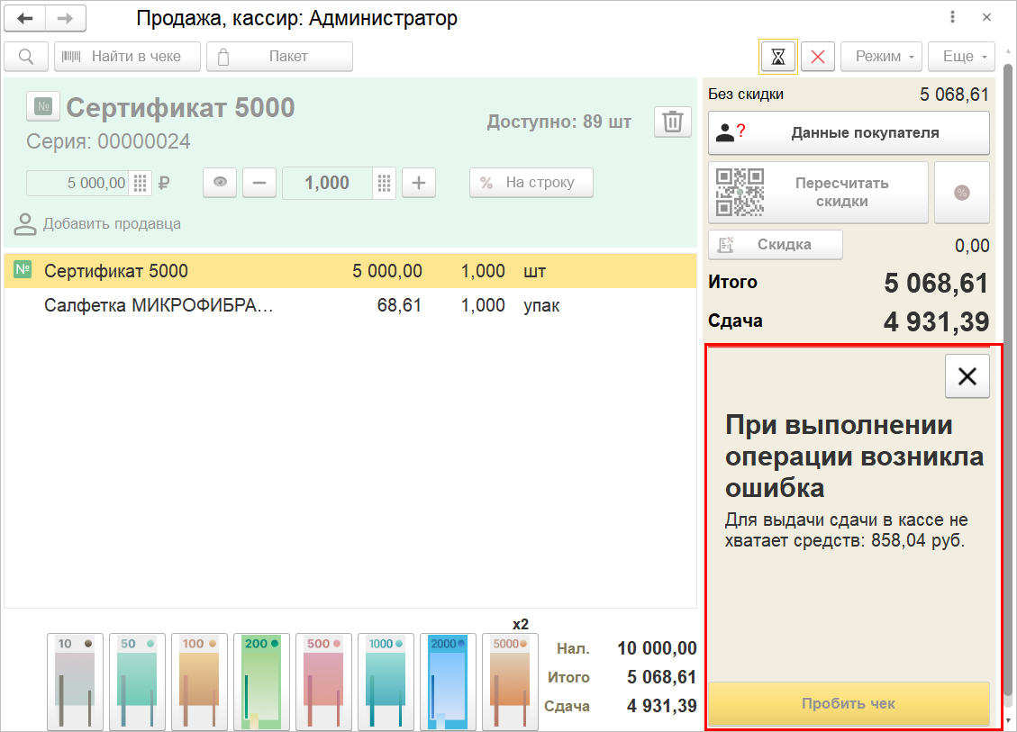 будет выводить соответствующие сообщения при нехватке наличных. Старшему кассиру будет