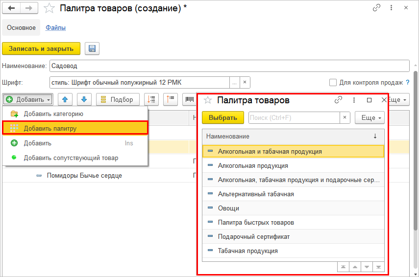 Вложенная палитра будет отображаться в плиточном интерфейсе в виде папки, в которую можно перейти для выбора товара.