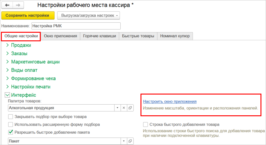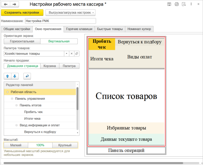 Теперь можно персонально настроить интерфейс рабочего места кассира. Для этого в настройки РМК добавлена отдельная страница "Окно приложения", на которой можно настроить оптимальное расположение групп элементов. Можно перемещать информационные панели в наиболее удобные места экрана, менять вложенные группы местами, выбирать масштаб, ориентацию экрана и другие параметры. При этом все изменения сразу будут видны на схеме предварительного просмотра.