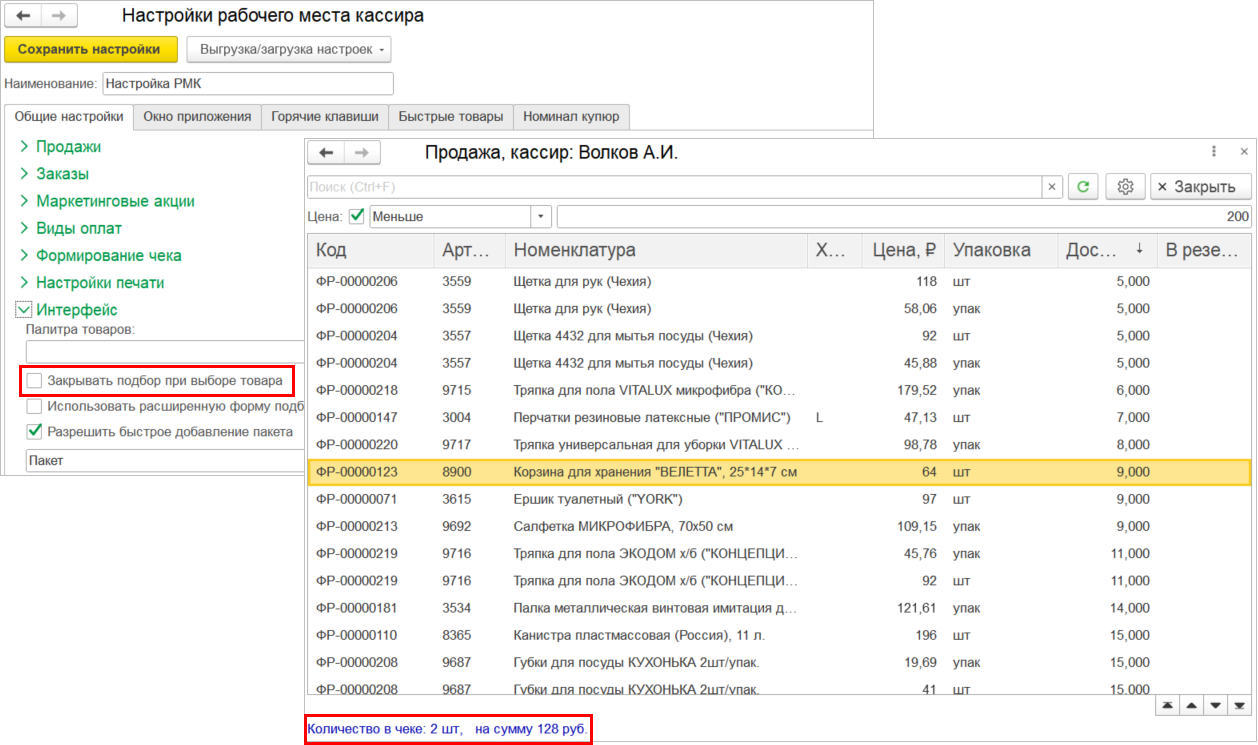 Для выделенной позиции внизу списка товаров будет отображаться информация о количестве уже добавленного в корзину товара и его сумме. Данные отображаются, если в группе "Интерфейс" настроек РМК отключена опция "Закрывать подбор при выборе товара".