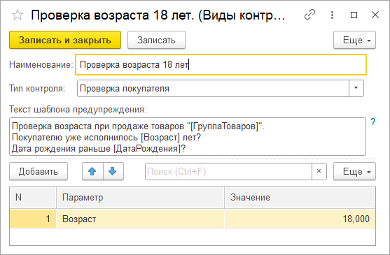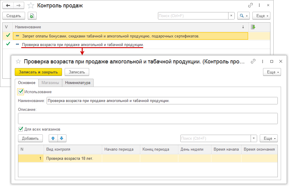 В рамках одного сценария могут быть включены несколько видов контроля. Например, при продаже алкоголя потребуется проверка возраста покупателя, запрет продаж в ночное время и праздничные дни.