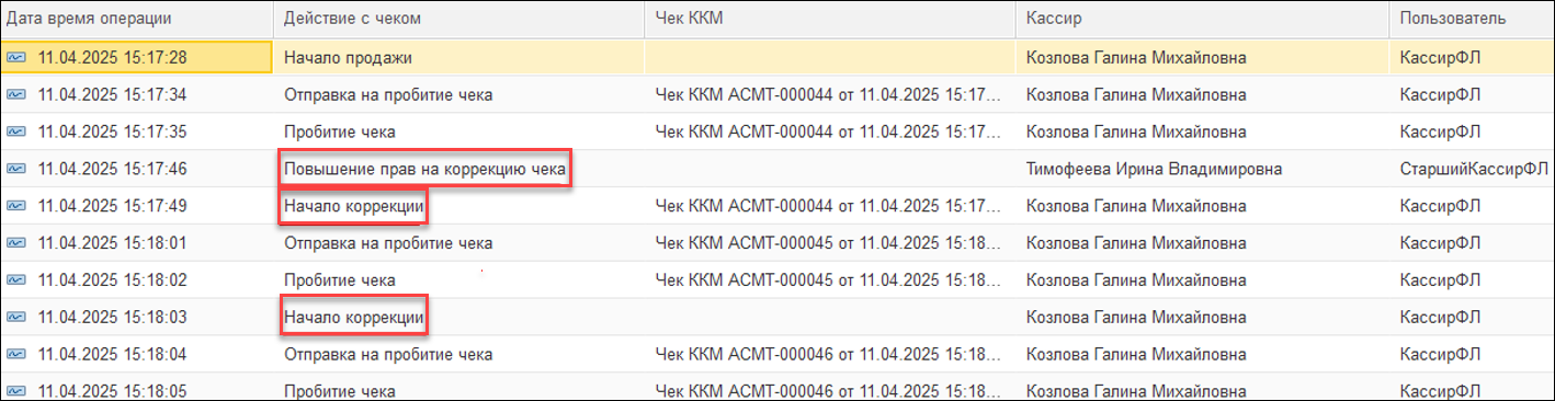 Доработали проверки и запрос на повышение прав под пользователем "кассир". Теперь, если старший кассир ввел пароль для разрешения оформления возврата под кассиром, дополнительно не будут запрашиваться права старшего кассира на операции удаления строки, удаления чека, уменьшения количества в текущем чеке возврата. Ниже пример журнала действий кассира. На коррекцию делается два чека.