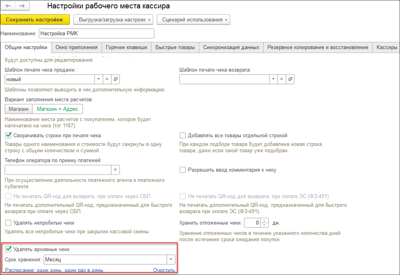 Добавили регламентное задание для удаления архивных чеков. В настройках РМК теперь можно указать "Срок хранения" архивных чеков.