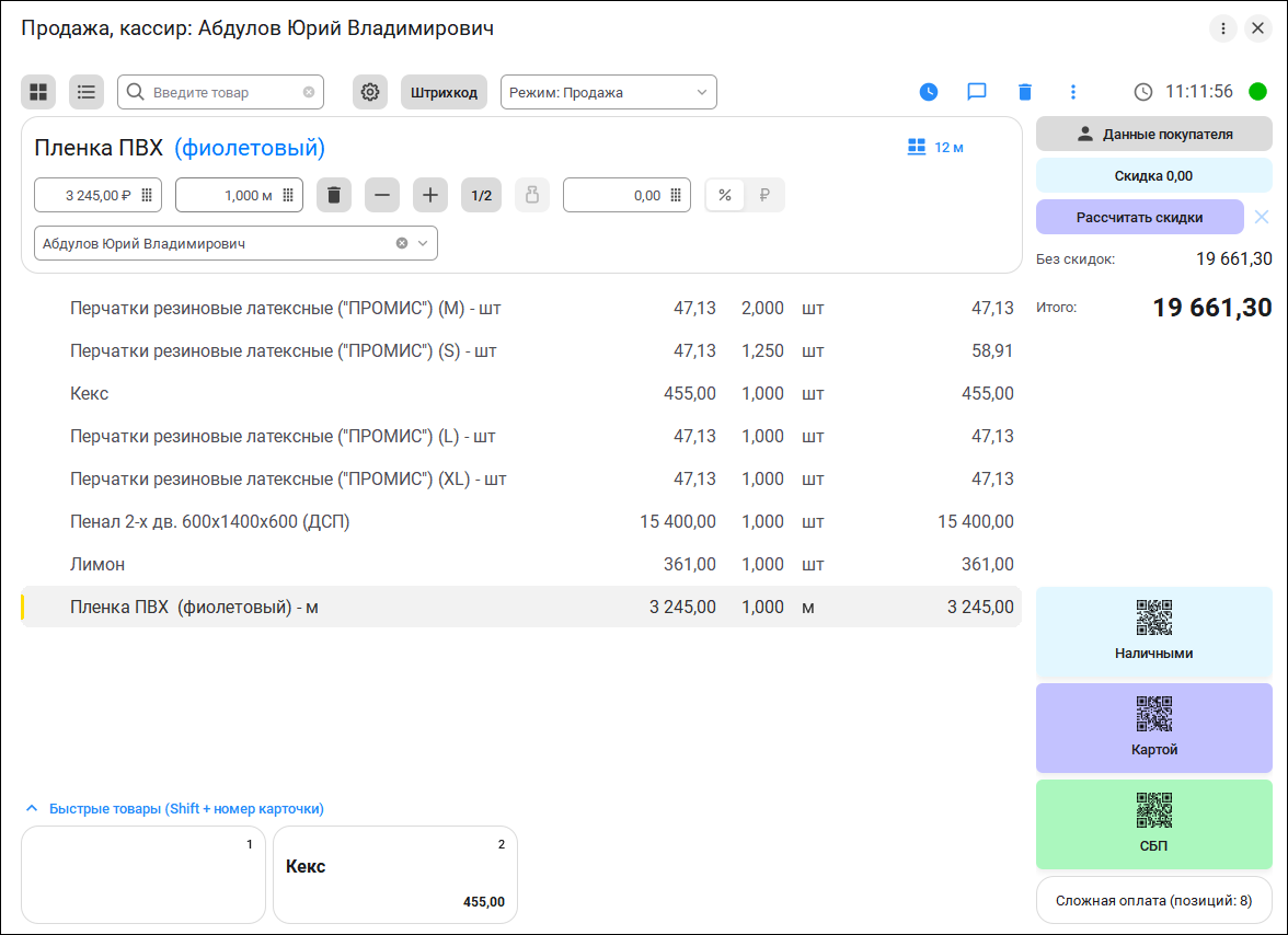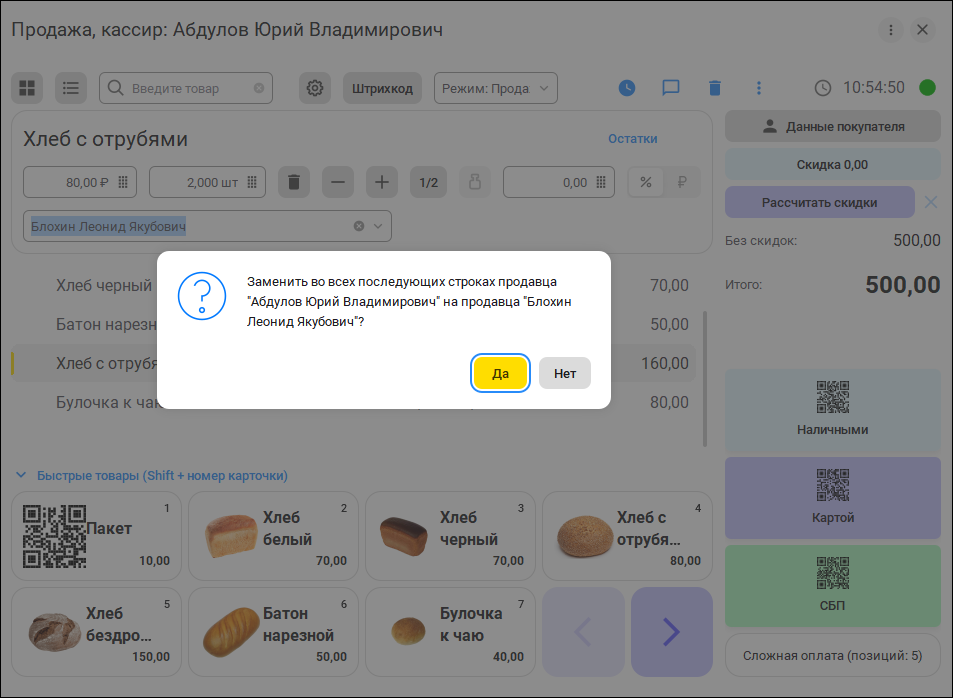 Добавили возможность быстро указывать продавца для нескольких строк товаров на рабочем месте. При выборе или смене продавца предлагается установить или заменить продавца в последующих строках списка товаров, если предыдущие продавцы в текущей и последующих строках совпадают и такой продавец не был ранее установлен в предыдущей строке.
