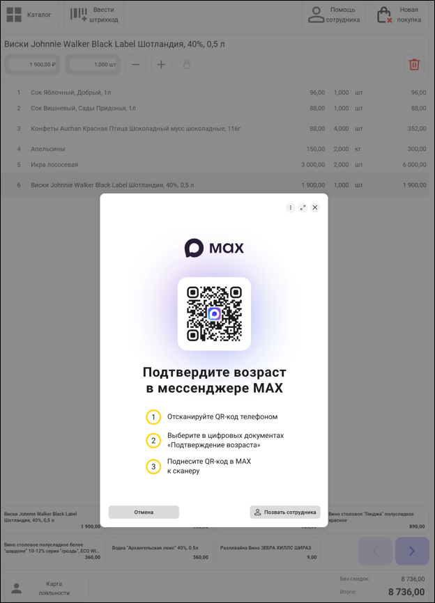 Покупатель сам может подтвердить возраст через мессенджер МАХ. На кассе самообслуживания при добавлении товара, требующего подтверждения возраста, на экране так же появится окно подтверждения возраста через MAX. Покупатель сможет отсканировать телефоном QR-код, отобразившийся на экране, выбрать в приложении соответствующий документ и поднести телефон к сканеру. Подробная инструкция для покупателя будет доступна на экране.