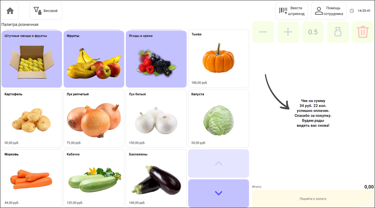 После успешного пробития чека на месте списка товаров выходит сообщение об успешной оплате.