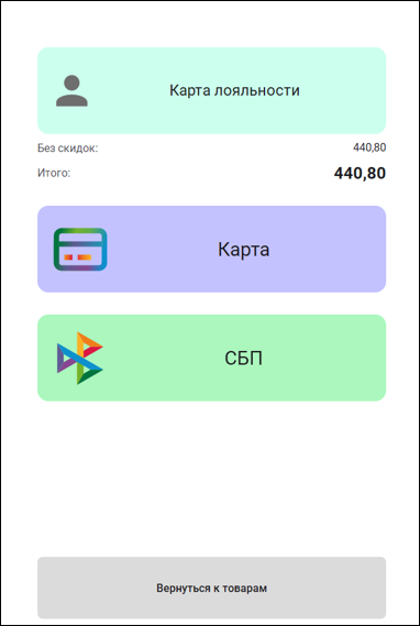 Цвета разделов "Наличные","Карта" и "СБП" совпадают с цветами кнопок быстрых оплат.
