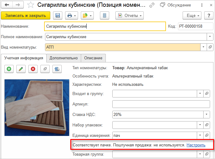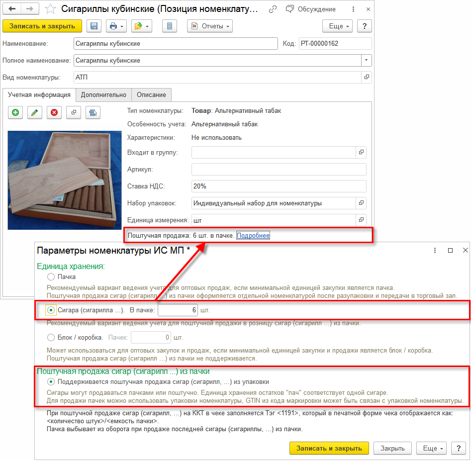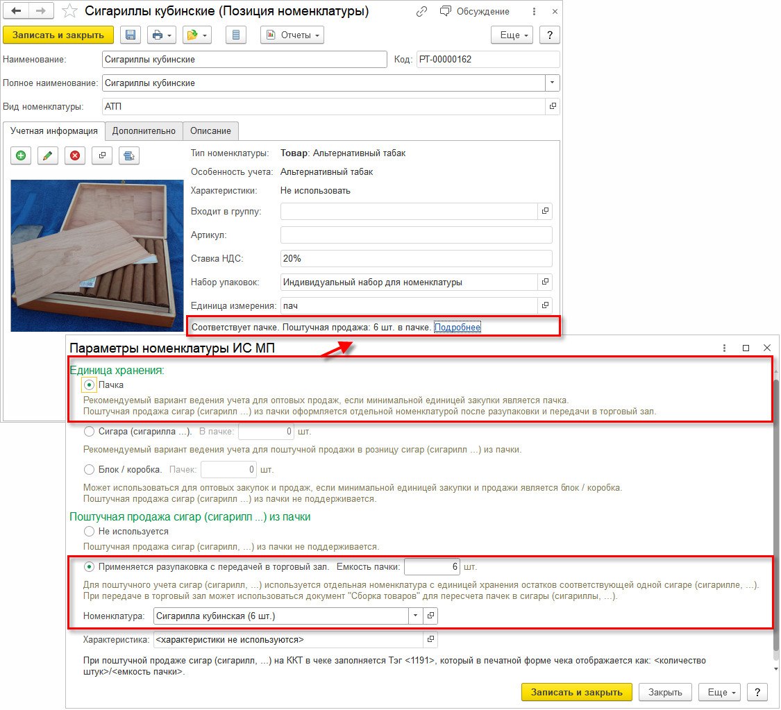 После сохранения карточки номенклатуры нужно выполнить разупаковку пачек в сигары при передаче в торговый зал для учета остатков (документ Сборка товаров с операцией Разборка на комплектующие).