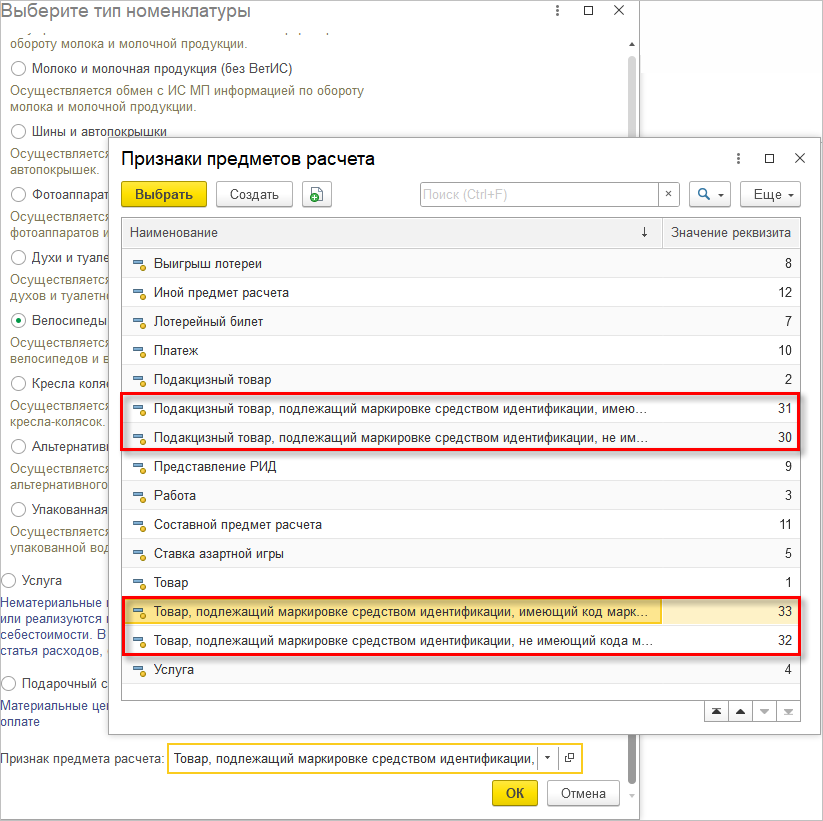 В новой версии программы был расширен список признаков предмета расчета для версии ФФД 1.2. Данный реквизит назначается для каждого вида номенклатуры в зависимости от необходимости платить акциз и других особенностей учета. Были добавлены новые значения реквизита: