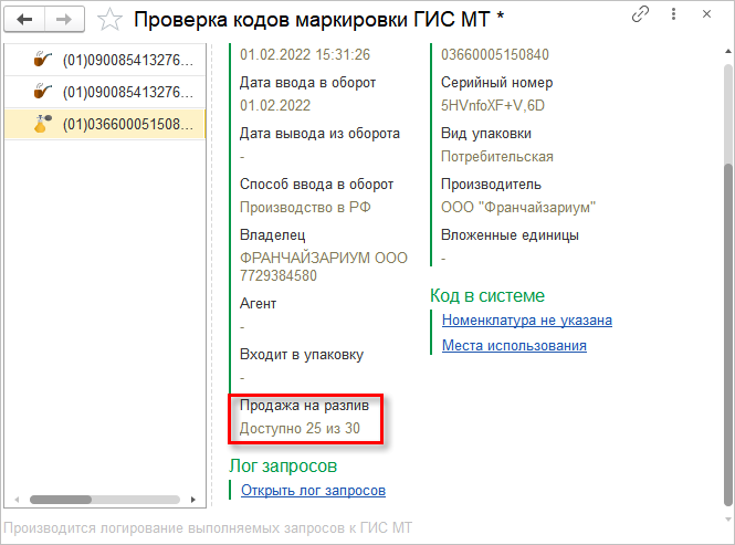 На форме проверки кодов маркировки ГИС МТ (Закупки – Обмен с ИС МП (обувь, одежда, табак…) – См. также – Проверка кодов маркировки) теперь отображается остаток в пачке по данным ГИС МТ.