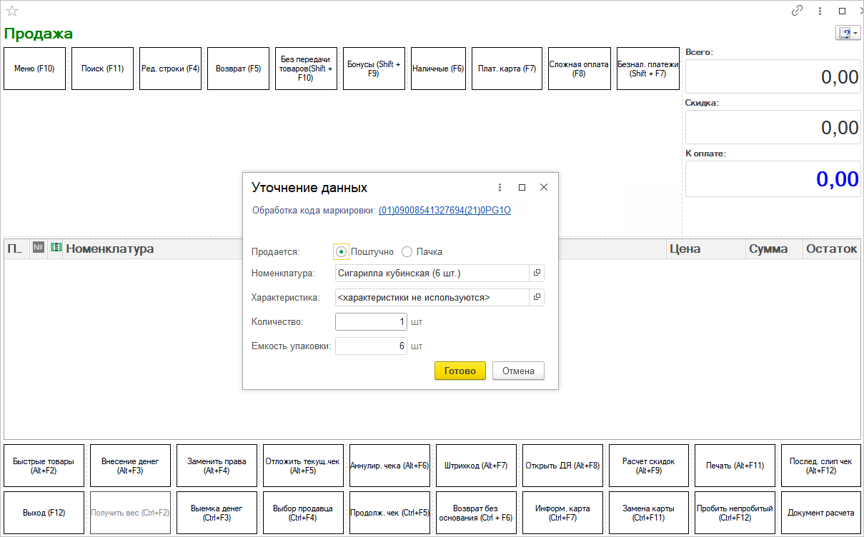 При оформлении первой продажи после сканирования кода маркировки кассир сможет выбрать режим поштучной продажи и указать количество сигар или же продать полностью пачку. Здесь же на форме Уточнение данных отображается Емкость упаковки.