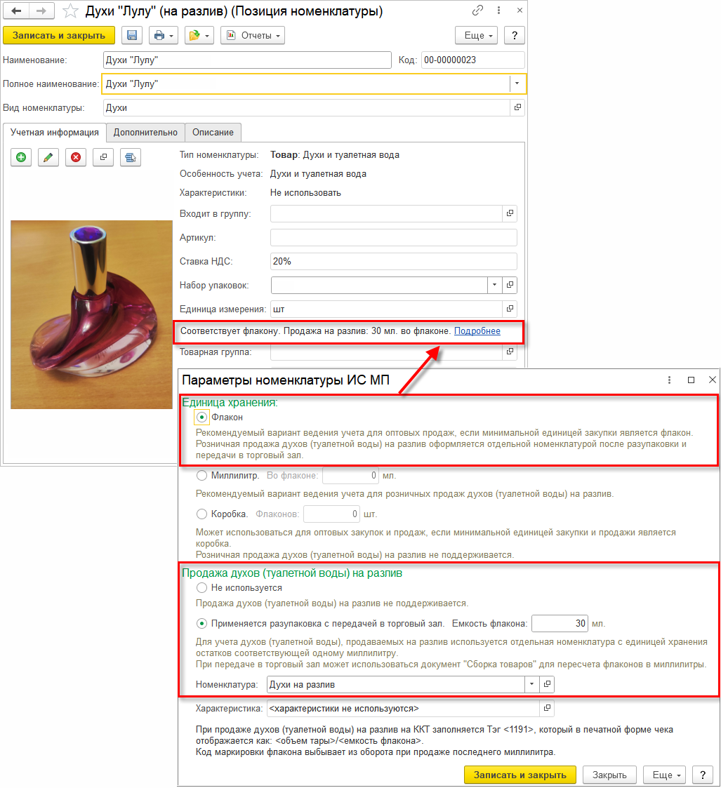 После сохранения карточки номенклатуры нужно выполнить разупаковку флаконов в миллилитры при передаче в торговый зал для учета остатков (документ Сборка товаров с операцией Разборка на комплектующие).