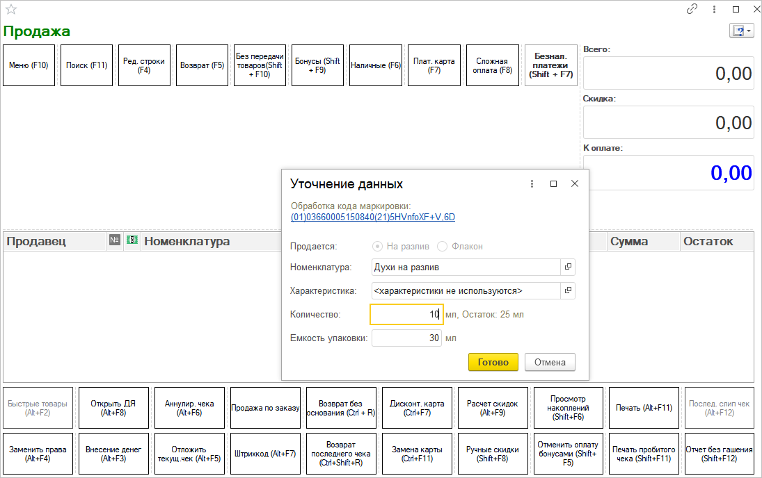 При оформлении первой продажи после сканирования кода маркировки кассир сможет выбрать режим На разлив и указать количество миллилитров или же продать полностью флакон. Здесь же на форме Уточнение данных отображается Емкость упаковки.