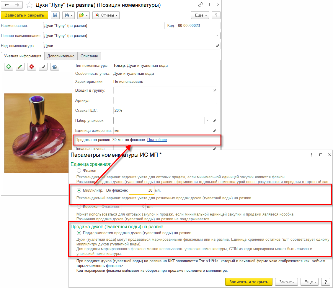 Ниже автоматически будет установлен флажок Поддерживается продажа духов (туалетной воды) на разлив.