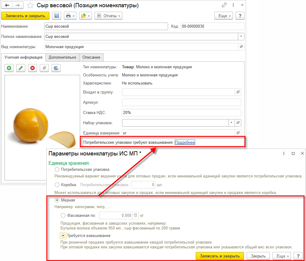 Для весовой продукции необходимо выбрать соответствующий тип – Мерная и уточнить особенность: