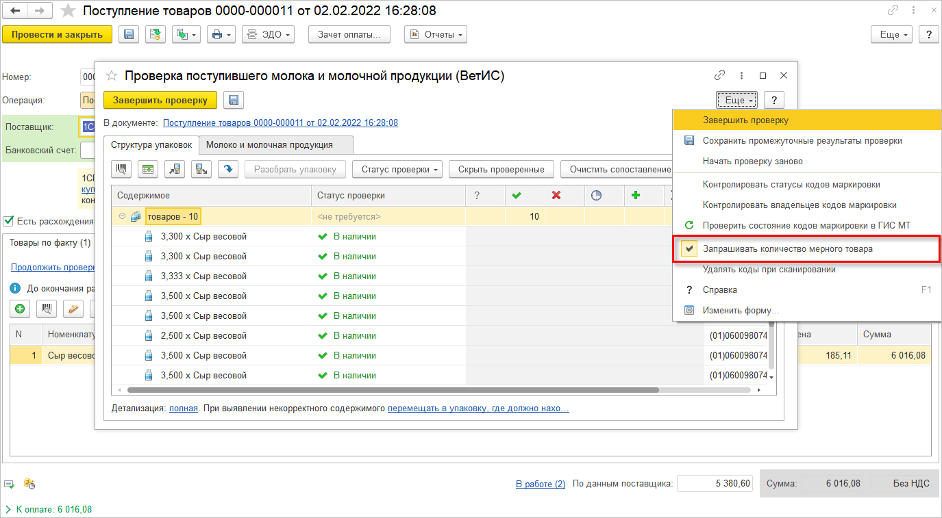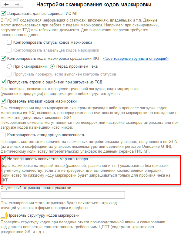 У пользователя имеется возможность не указывать количество мерной продукции на данном этапе. Для этого в настройках сканирования (Администрирование – Интеграция с ИС МП (обувь, одежда, табак…) – Настройки сканирования кодов маркировки) нужно установить флажок Не запрашивать количество мерного товара. С такой настройкой при приемке товаров кладовщик сможет взвесить всю партию продукции одновременно и указать общий вес в форме проверки, без привязки к учетному количеству. Данную операцию потребуется выполнить при пробитии чека на ККТ.