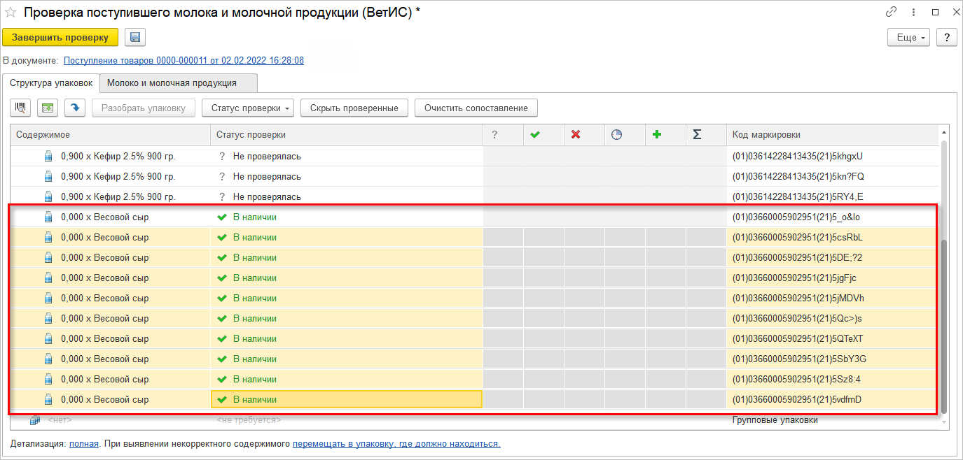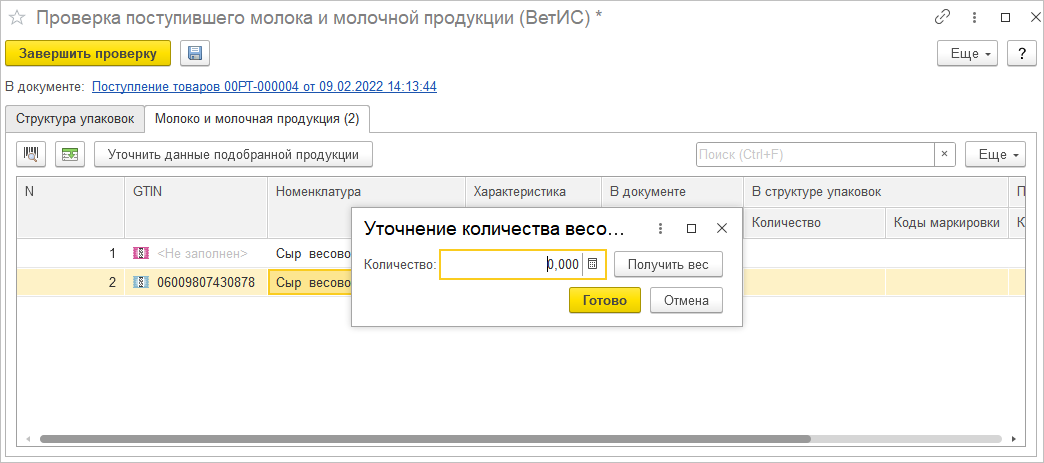 При оформлении Поступления товаров в форме проверки поступившей молочной продукции для расфасованной продукции автоматически определится вес каждой потребительской упаковки. Для продукции, требующей взвешивания, определить вес каждой потребительской упаковки автоматически не удастся.