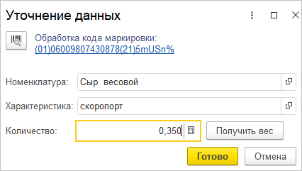 Общий вес продукции, для которой не производилось взвешивание каждой потребительской упаковки, может быть указан отдельно по команде Уточнить данные подобранной продукции на вкладке Молоко и молочная продукция или по двойному клику мышкой на поле Количество. В открывшейся форме необходимо вручную ввести вес или с помощью команды Получить вес, если подключены весы.