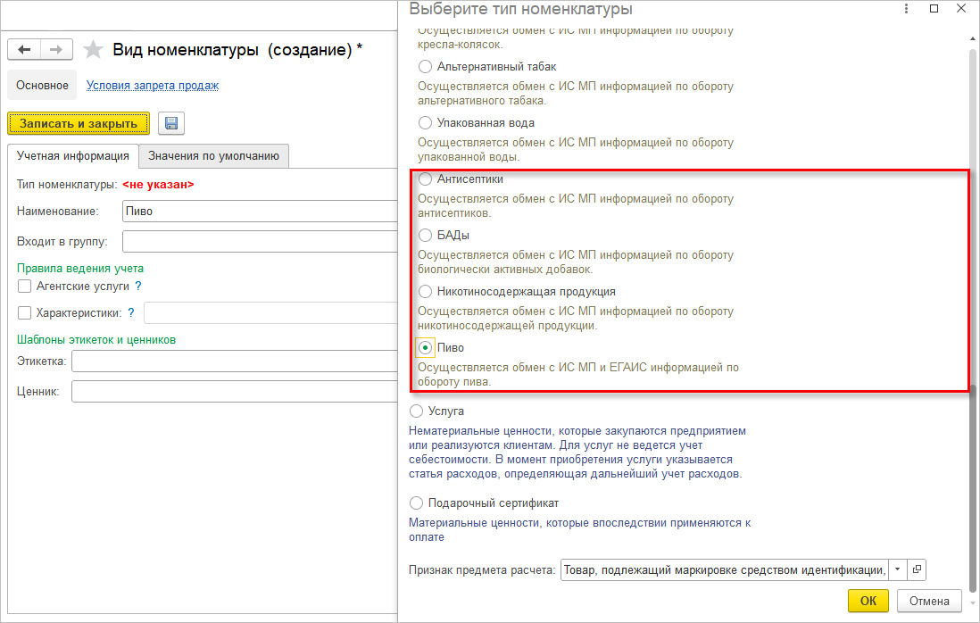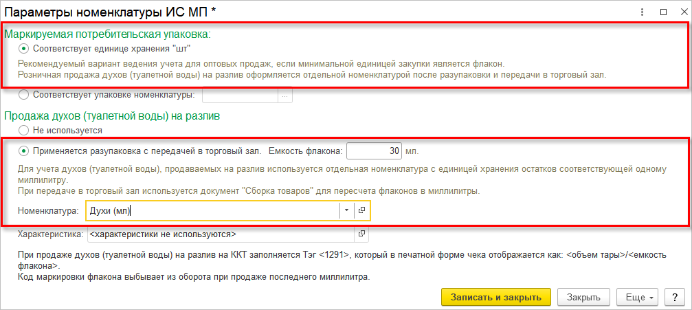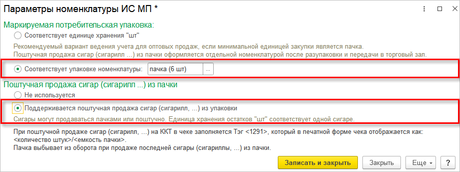 Для ведения учета в сигарах/мл. на форме Параметры номенклатуры ИС МП необходимо выбрать вариант Соответствует упаковке номенклатуры и указать соответствующую упаковку.