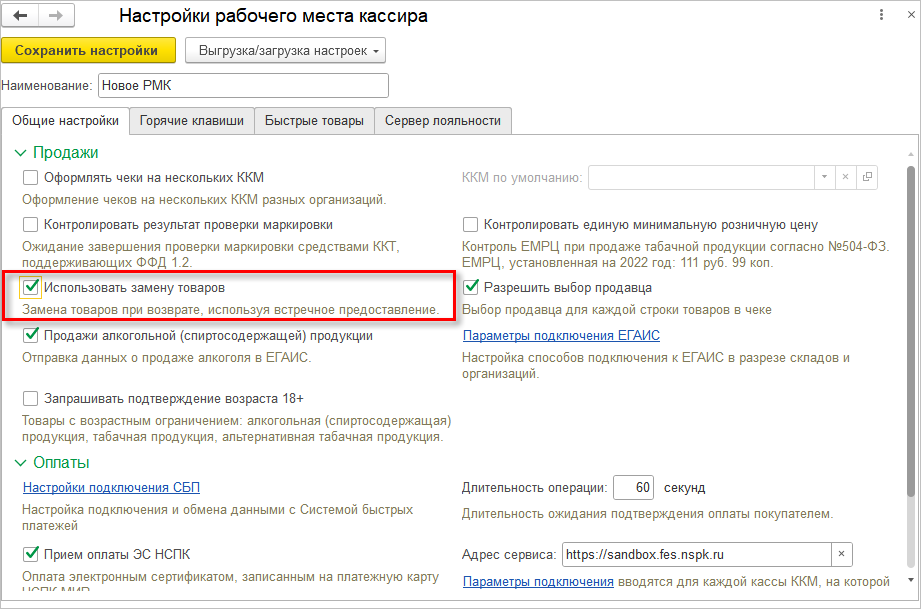 В новой версии программы поддержана замена товара выставлением чеков на встречное предоставление. Для реализации данной возможности необходимо в группе Продажи включить переключатель Использовать замену товаров (Администрирование – Продажи – Настройки нового РМК).
