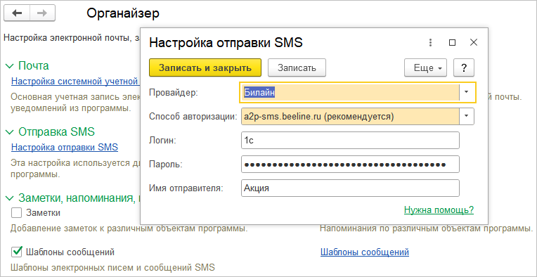 По гиперссылке Настройка отправки SMS и шаблонов сообщений необходимо включить флажок Шаблоны сообщений, перейти в отдельное окно и ввести настройки отправки SMS.