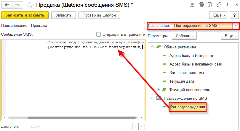 При создании шаблона необходимо ввести текст отправляемого сообщения и обязательно добавить параметр Код подтверждения - это генерируемый системой, четырехзначный код.