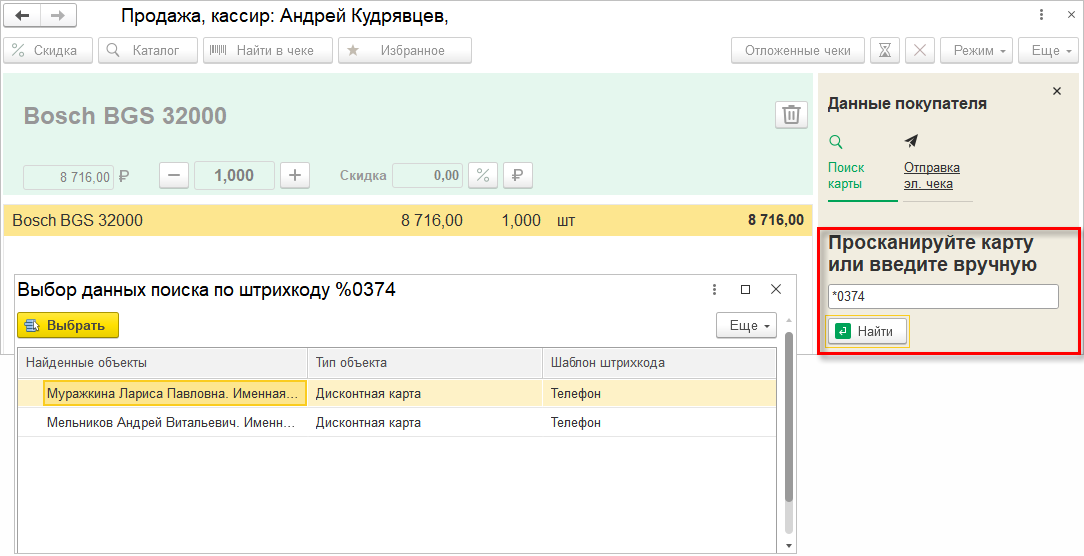 Для сохранения конфиденциальности номера телефона покупателя кассир может запросить не полный номер, а последние цифры и ввести их с префиксом «*» (звездочка). Например, при вводе значения «*0374», в базе будет произведен поиск телефонных номеров, оканчивающихся на «0374». Если будет найдено несколько номеров, то его потребуется уточнить в окне выбора данных поиска.