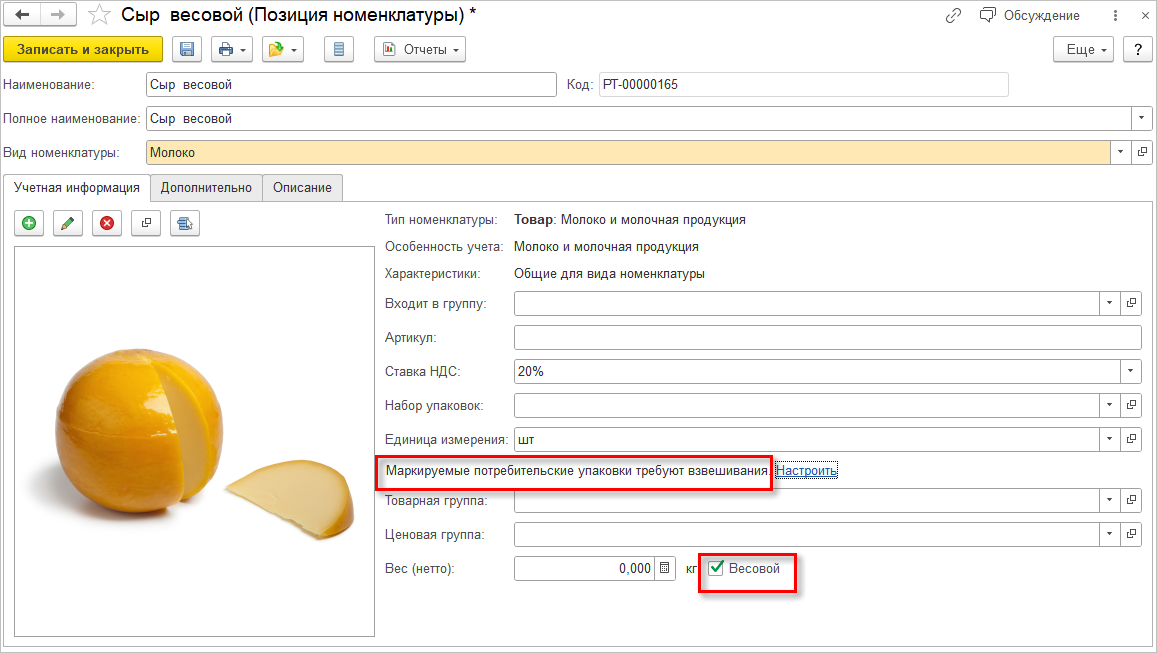 Если продукция является весовой, то необходимо в соответствующей карточке номенклатуры установить флаг Весовой. Таким образом, при дальнейшей работе программа определит, что маркируемая упаковка требует взвешивания.