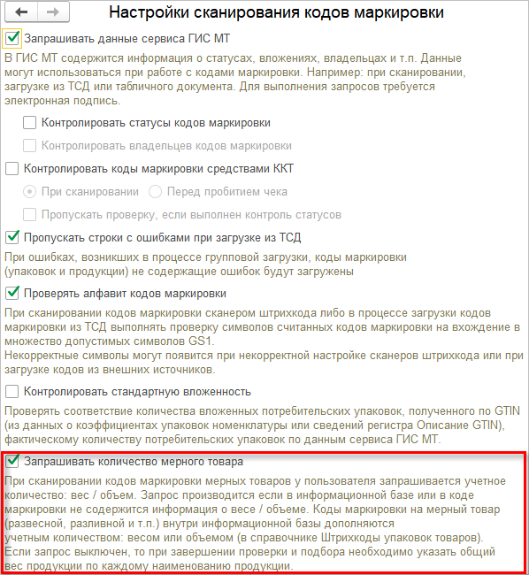 Но у пользователя имеется возможность настроить на каком этапе он будет указывать количество весовой продукции: при приемке или при продаже. Для этого в настройках сканирования (Администрирование – Интеграция с ИС МП (обувь, одежда, табак…) – Настройки сканирования кодов маркировки) предусмотрен флажок Запрашивать количество мерного товара.