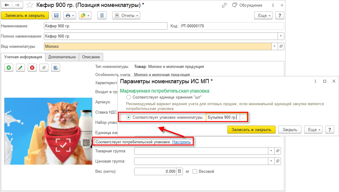 Для фасованного в заводских условиях товара (например, бутылка кефира 900 мл.) в карточке номенклатуры флаг Весовой устанавливать не нужно. Необходимо перейти по ссылке Настроить (ниже реквизита Единица измерения), в открывшейся форме выбрать вариант Соответствует упаковке номенклатуры и указать упаковку с требуемым весом/объемом.