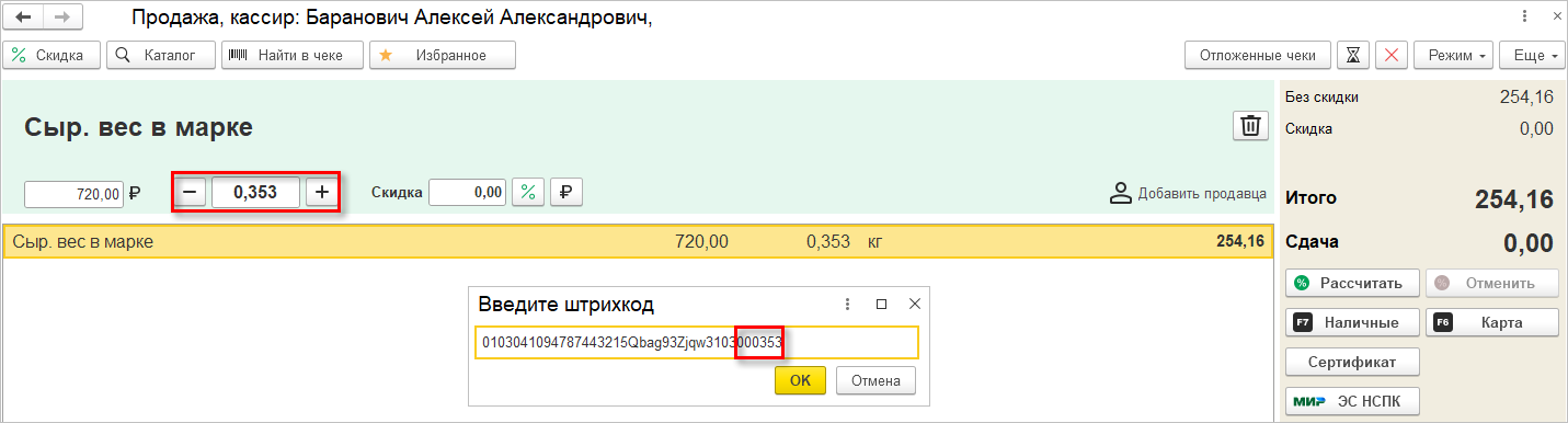 Если вес продукции был заранее определен, то в РМК он автоматически заполнится при считывании кода, в противном случае потребуется его уточнить.