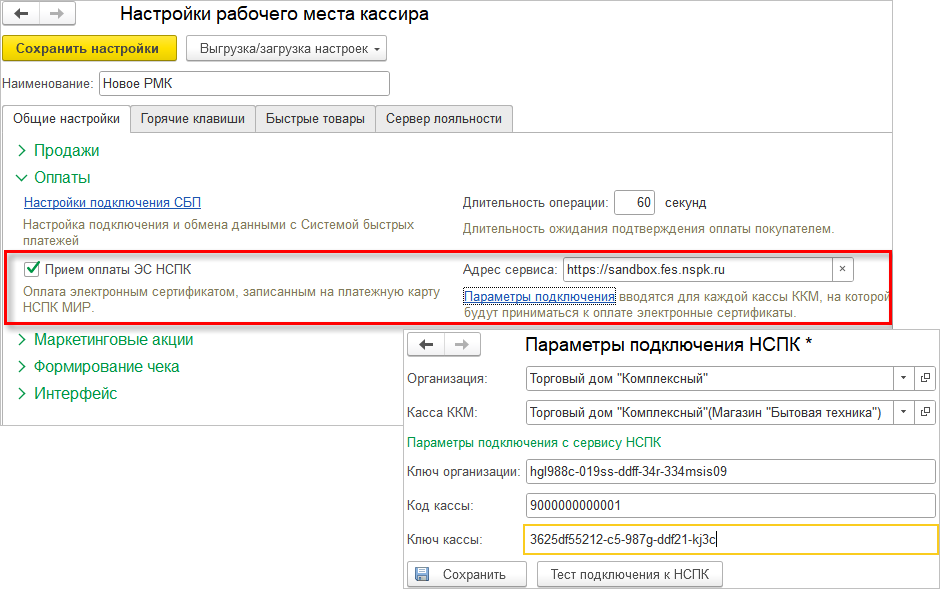 После заполнения реквизитов можно протестировать соединение с помощью кнопки Тест подключения к НСПК.