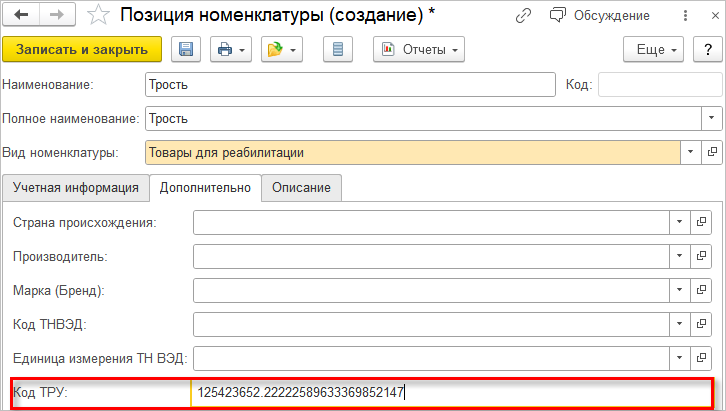 Далее необходимо настроить номенклатуру. Для оплаты сертификатом НСПК в каждой карточке номенклатуры на закладке Дополнительно должен быть заполнен новый обязательный реквизит - Код ТРУ.