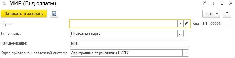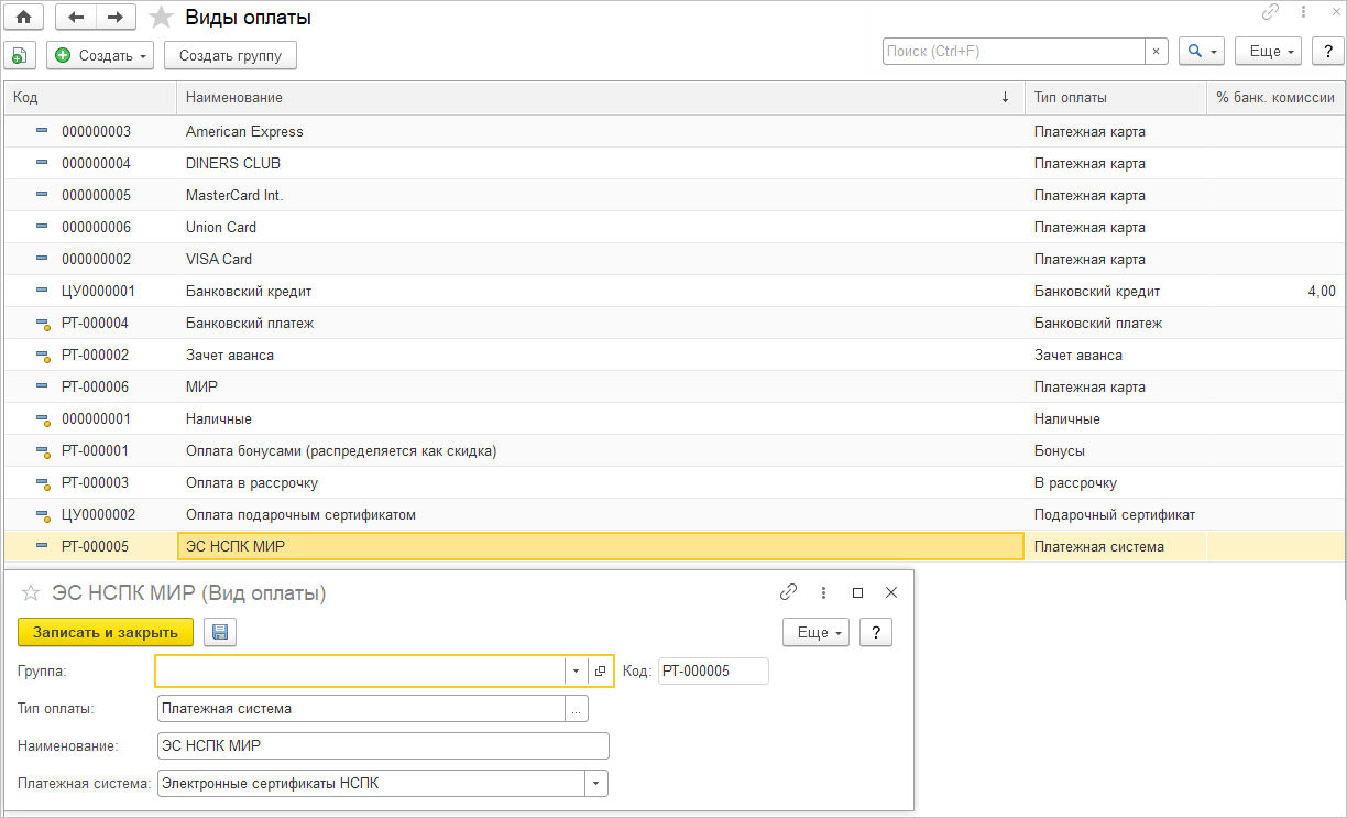 Следом нужно настроить вид оплаты с типом оплаты Платежная карта, указав ту же платежную систему - Электронные сертификаты НСПК. Таким образом, будет связан один вид оплаты с другим, оплата картой и оплата сертификатом.