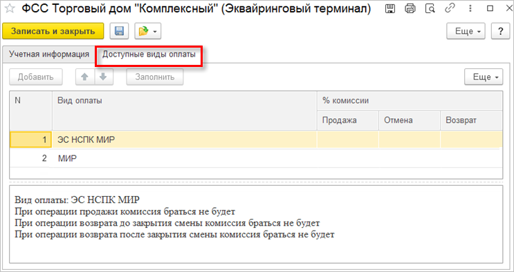 Затем в карточке терминала необходимо перейти на вкладку Доступные виды оплаты на терминале и добавить ранее созданные элементы с типом Платежная система и Платежная карта с привязкой к платежной системе Электронные сертификаты НСПК. Завершить настройку оборудования следует сохранением внесенных данных.