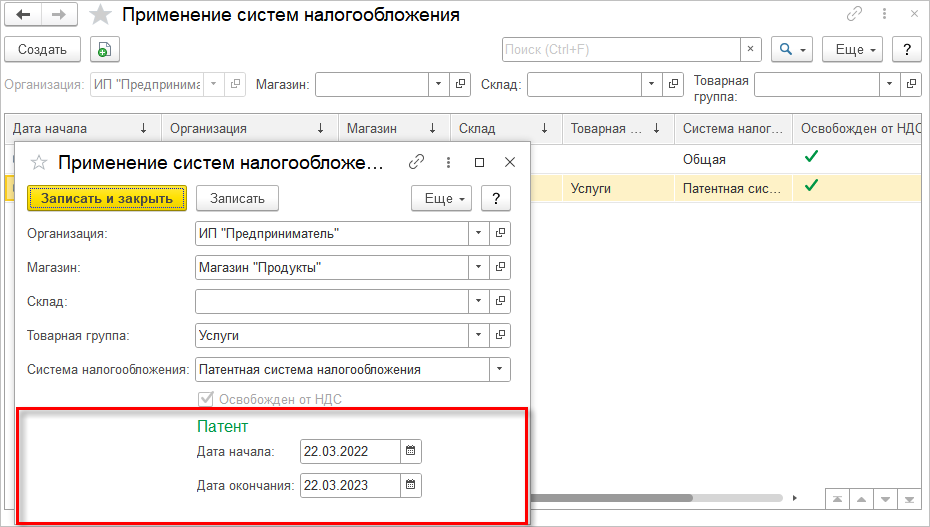 Таким образом, для новых записей в регистре Применение систем налогообложения для Патентной системы налогообложения теперь обязательны для заполнения даты начала и окончания действия. Запись будет действительна только в рамках этого периода.